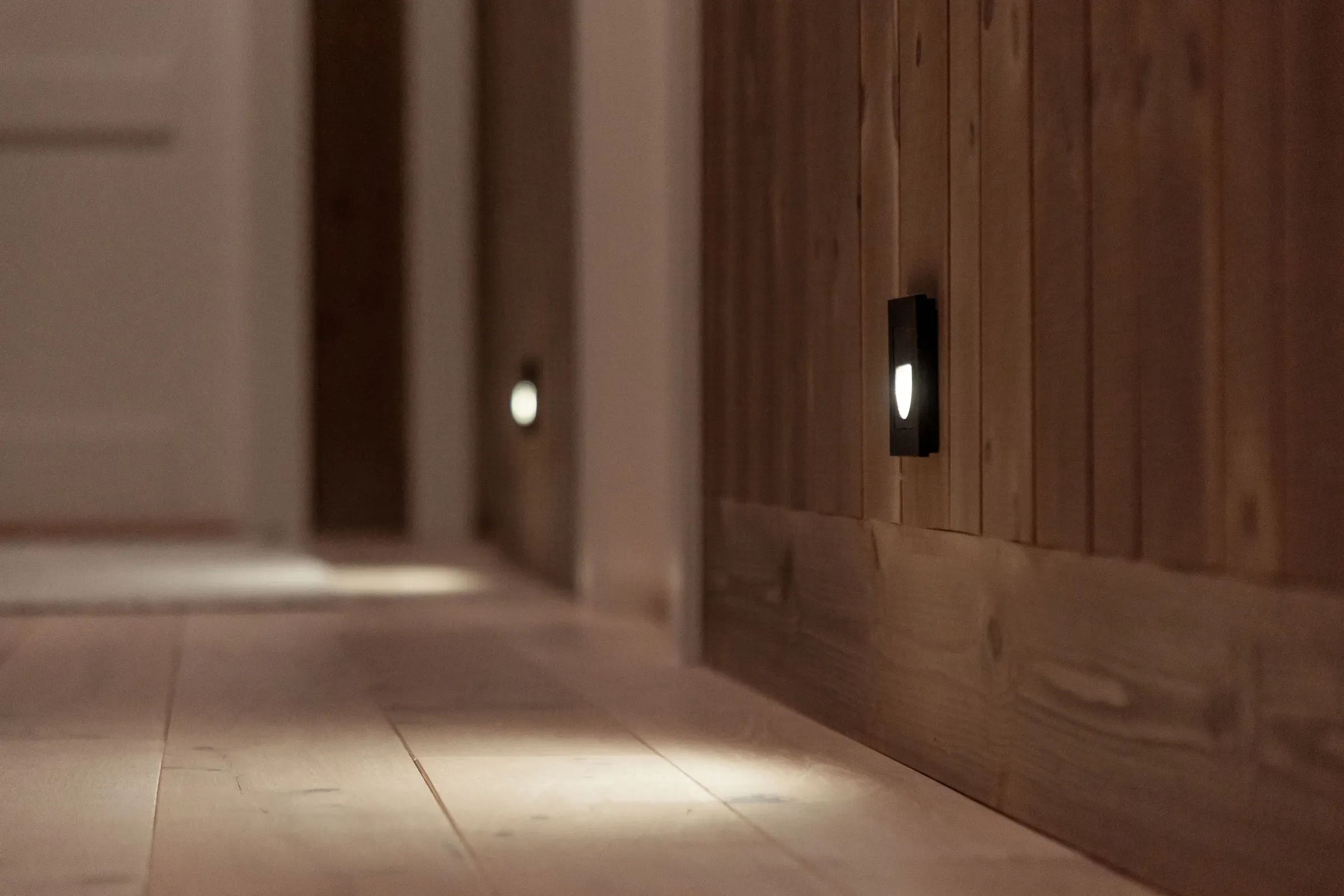 LED-striper eller små punktlamper langs gulvet kan gi veiledende lys om natten.